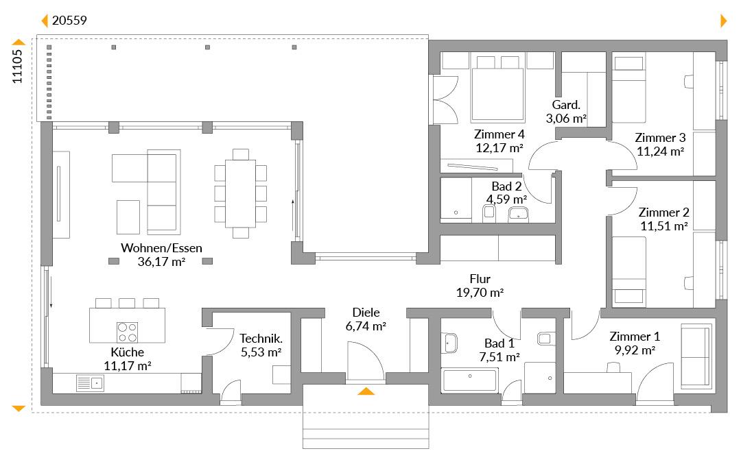 Ab ins Freie! Das großzügig überdachte Sonnendeck lockt nach draußen – zum Essen, zum Relaxen, zum Spielen mit Kindern oder Enkeln. Die dekorative Lamellenwand spendet zusätzlichen Schatten oder bewährt sich als Windschutz. Praktisch ist der Zugang zur Terrasse über eine platzsparende Schiebetür, die sich selbst im geöffneten Zustand nie in den Weg stellt.