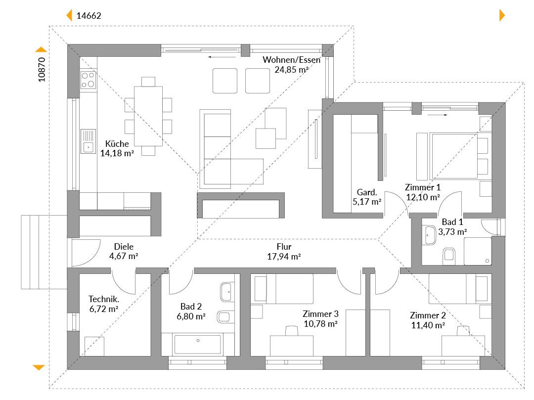 Das perfekte Wohnkonzept des 118 Quadratmeter großen Modulbungalows passt auch gut unter ein Walmdach, denn der komfortable Grundriss bietet auch hier die besten Möglichkeiten für Paare oder kleine Familien. Trotz des klassischen Walmdaches wirkt das Haus vor allem dank der schönen Panoramaverglasung außergewöhnlich und modern. Zudem gibt es noch ein wenig Stauraum auf dem Dachboden.