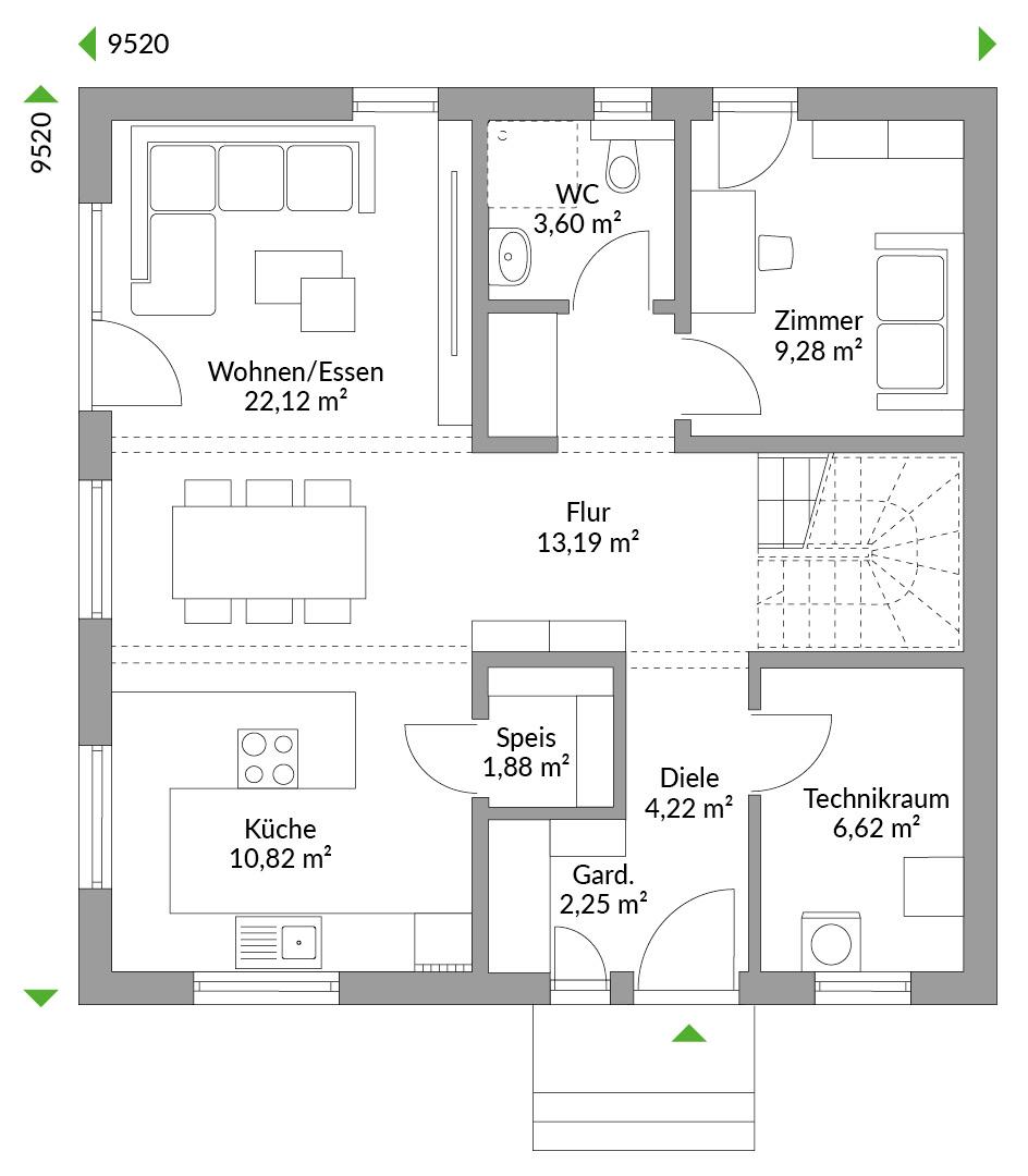 Ein zusätzliches Arbeits- oder Hobbyzimmer im Erdgeschoss bietet dank einer vorgelagerten zusätzlichen Garderobensituation absolute Ruhe zum Arbeiten oder Rückzugsmöglichkeit vom sonst trubeligen Alltag im Erdgeschoss. Auch beim Family 147 gilt. Wessen Baurecht es zulässt, kann mit einer Kniestockerhöhung mehr Wohnfläche gewinnen. Zusätzliches Licht gewinnt man optional durch ein Dachflächenfenster im Treppenhaus.