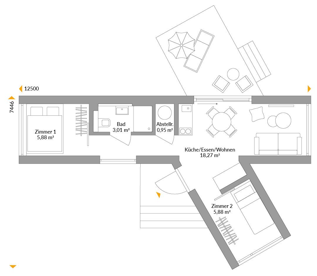Wenn das Grundstück ein etwas breiteres Haus erlaubt – in diesem Fall reichlich sieben Meter – kann ein zusätzliches schmales S-Modul die Wohnsituation komfortabler gestalten. Ein kleines Zimmer und ein einladender Eingangsbereich werden durch das Andocken dieses Moduls im Vergleich zum elf Quadratmeter kleineren NEXT Holiday 23 S-1 gewonnen. Eine weitere Panorama-Glaswand lässt das Gefühl aufkommen, mitten in der blühenden Landschaft zu sitzen.